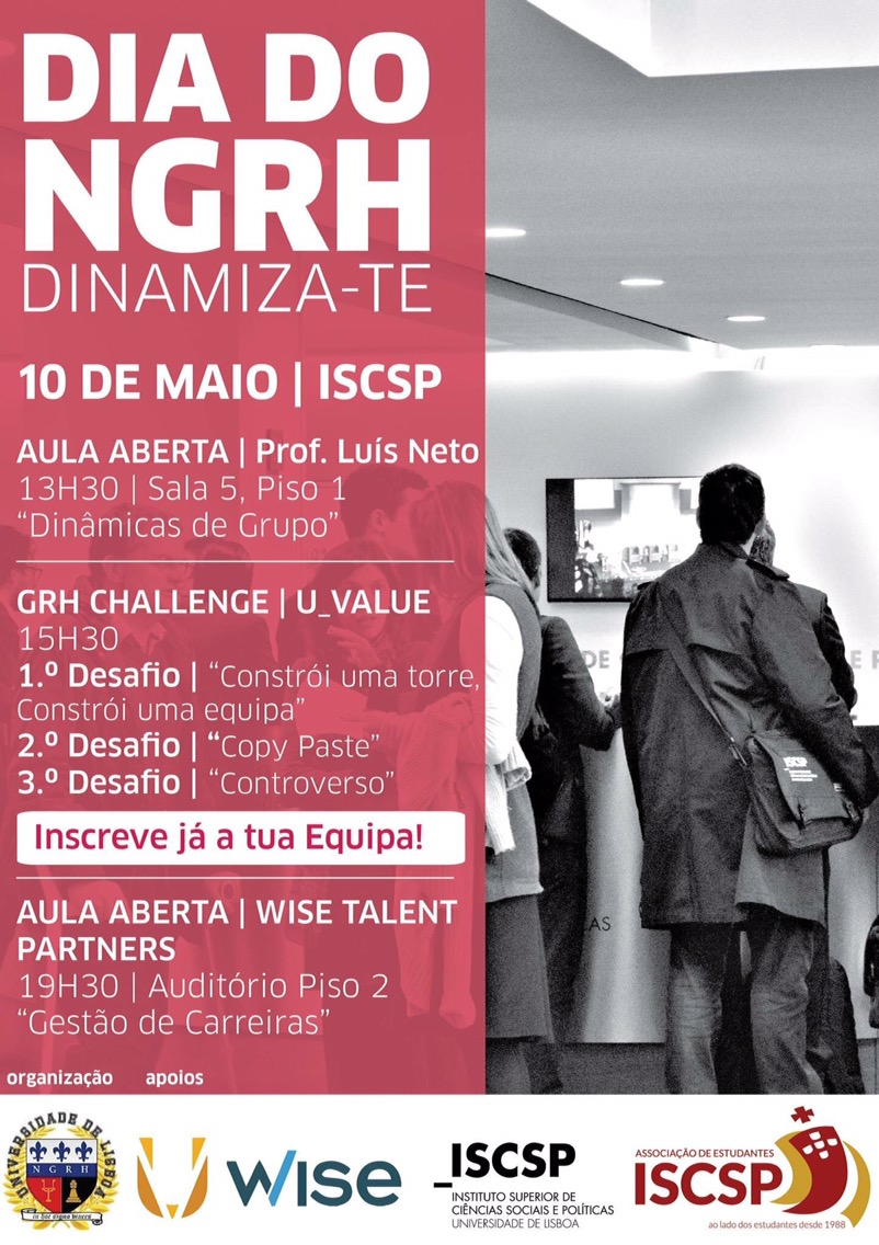 O núcleo de estudantes de Gestão de Recursos Humanos do Instituto Superior de Ciências Sociais e Políticas organizou um evento, no âmbito do Dia do NGRH, que irá ter lugar amanhã, dia 10 de maio, na sala 5 do piso 1 e no auditório do piso 2. É a primeira edição do evento e é dirigido a todos os ISCSPianos.