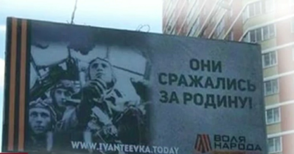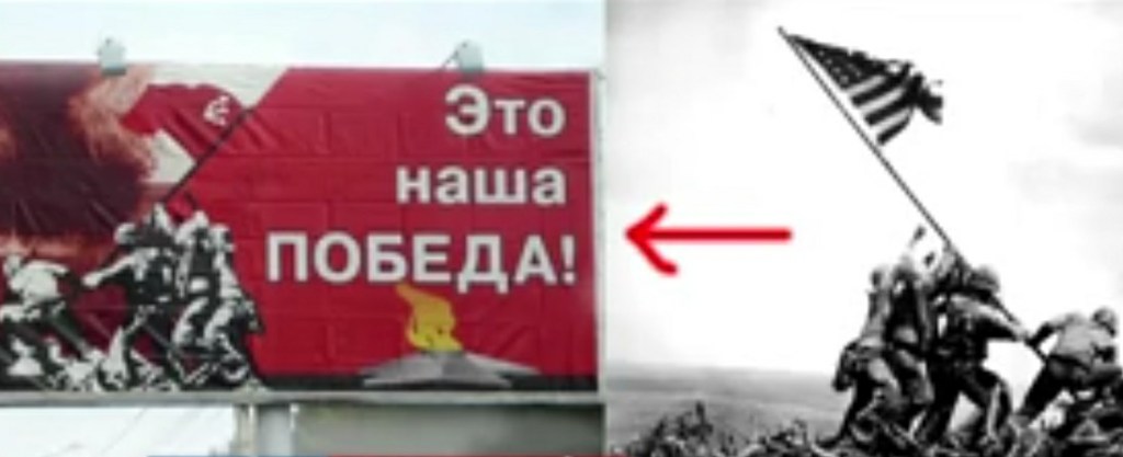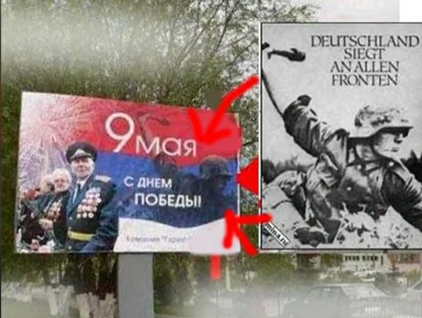 Este cartaz, localizado na cidade de Alapayevsk, apresenta uma fotografia de um conjunto de alegados soldados da URSS, emoldurados pelas chamadas “fitas de São Jorge”, um símbolo muito associado ao Dia da Vitória, que pretende homenagear aqueles que lutaram pela pátria soviética durante a Segunda Grande Guerra. Porém, Larissa Ustyuzhanina, assistente de um deputado da Duma Federal Russa (câmara baixa da Assembleia Federal), notou que a fotografia escolhida corresponde, afinal, a uma multidão de soldados alemães, combatentes do regime nazi e o cartaz foi imediatamente removido.