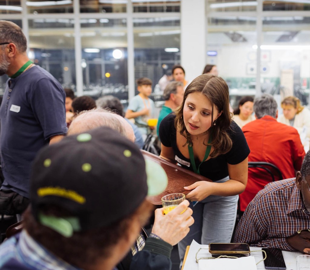 No contexto dos jantares comunitários, que é onde estou mais presente, o principal objetivo é criar espaços e momentos de encontro seguros e confortáveis, onde as pessoas, estejam em situação de sem-abrigo ou com-abrigo, possam partilhar uma refeição servida por voluntários de empresas, associações, escolas, comunidades de fé ou, até mesmo, grupos informais de amigos. Nestes espaços há diferentes equipas de voluntários de modo a que cada um possa escolher com a qual mais se identifica e para que os jantares decorram da maneira mais organizada possível. Eu comecei na equipa de voluntários que serve a comida às mesas e, atualmente, estou na equipa que acolhe. Apesar de ter experimentado quase todas as equipas e de, em qualquer uma delas, acontecer toda a magia dos jantares comunitários, a equipa que acolhe é o meu abrigo já há alguns anos. Esta equipa encarrega-se de garantir que tanto os voluntários como os convidados estão satisfeitos e que os jantares decorrem da melhor maneira possível.