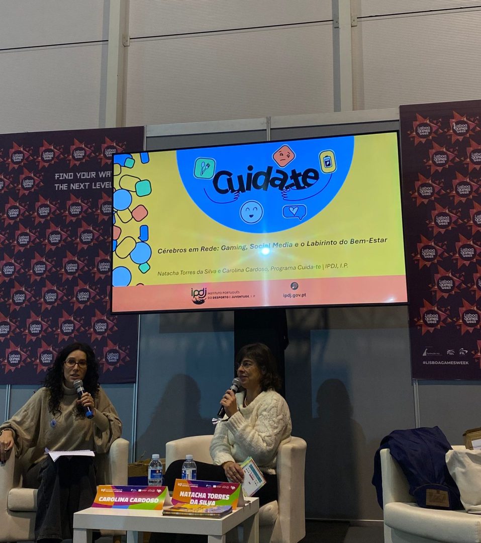 Natacha Torres da Silva e Carolina Cardoso, psicólogas e membros da coordenação nacional do programa Cuida-te do Instituto Português de Desporto e Juventude, apresentaram a talk “Cérebros em rede: Gaming, Redes Sociais e o Labirinto do Bem-Estar“. O programa teve lugar no segundo dia da Lisboa Games Week e contou com a participação ativa do público ao longo da palestra.