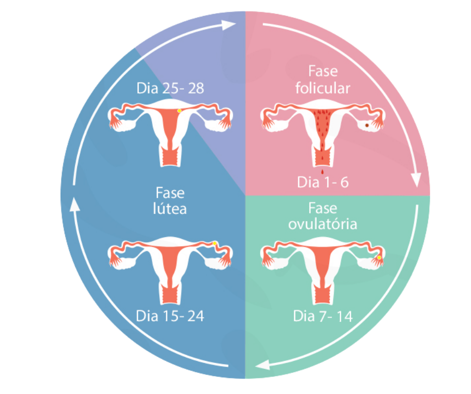 Mas o ciclo menstrual é muito mais que isso. Pode ser divido em mais 3 fases: folicular, ovulação e lútea.