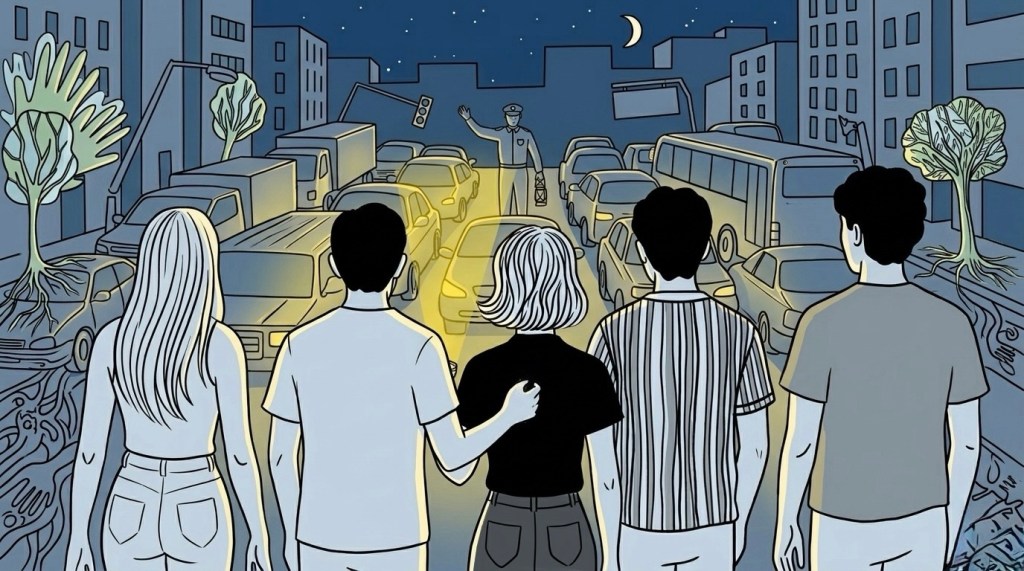 Descrição da imagem de capa: Cinco jovens em Madrid observando um agente a dirigir o trânsito.